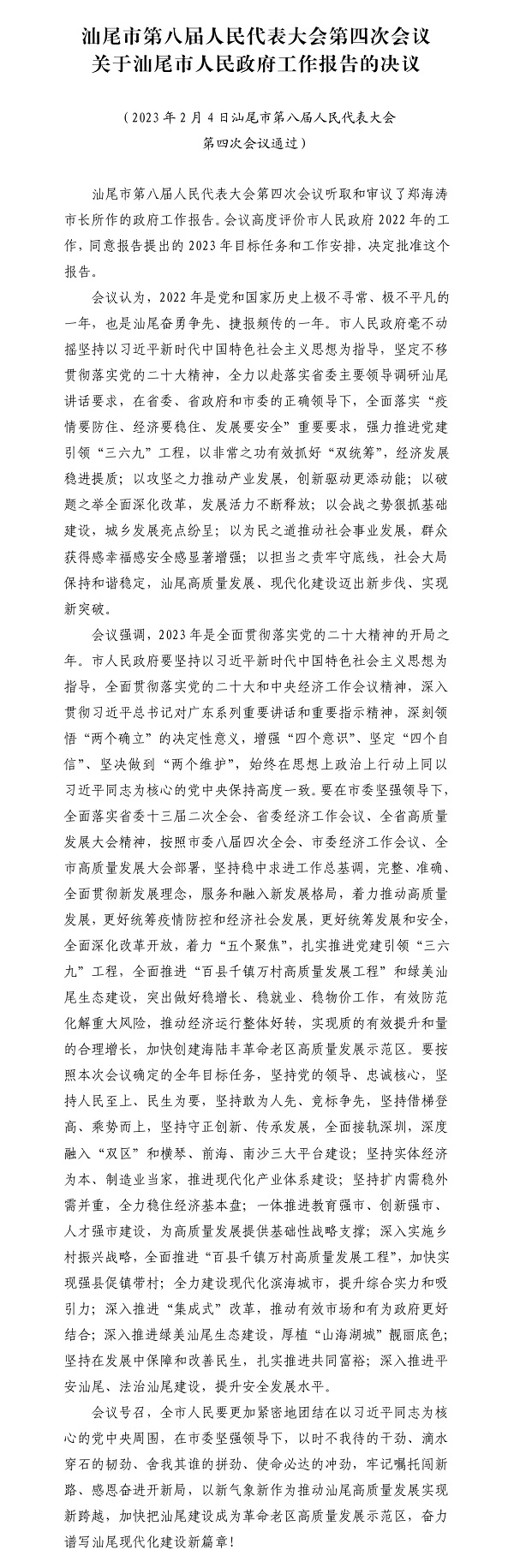 汕尾市第八屆人民代表大會第四次會議關于汕尾市人民政府工作報告的決議