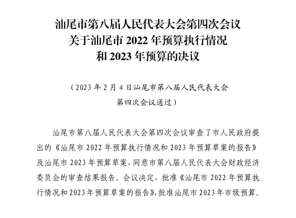 汕尾市第八屆人民代表大會(huì)第四次會(huì)議關(guān)于汕尾市2022年預(yù)算執(zhí)行情況和2023年預(yù)算的決議